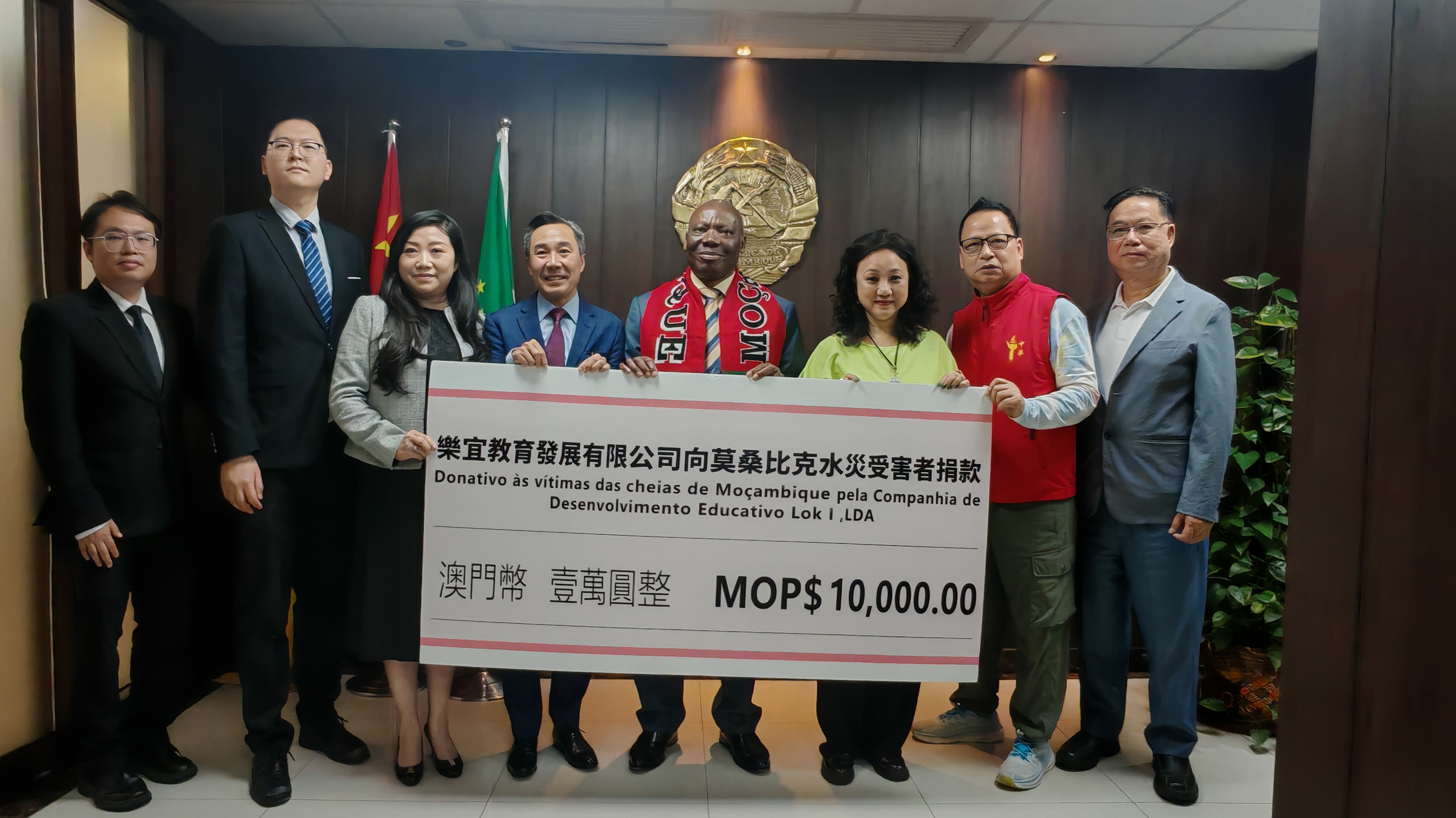 應莫桑比克共和國駐澳門總領事的要求,三月三十日上午十一時,澳門公職人員協會大會主席姍桃絲、澳門博彩中介人專業協會主席余堯洪、中華傳統文化協會副主席余堯輝、樂宜教育發展有限公司董事總經理黃惠子、執行董事陳家亮等一行,前往莫桑比克駐澳門總領事館,捐贈一萬澳門元善款,持續為當地抗洪救災及重建工作貢獻力量。