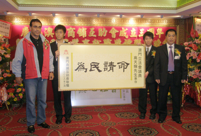 澳門商鋪互助會會長呂錦泉致送 "為民請命"紀念碑給澳門立法會議員高天賜先生。
