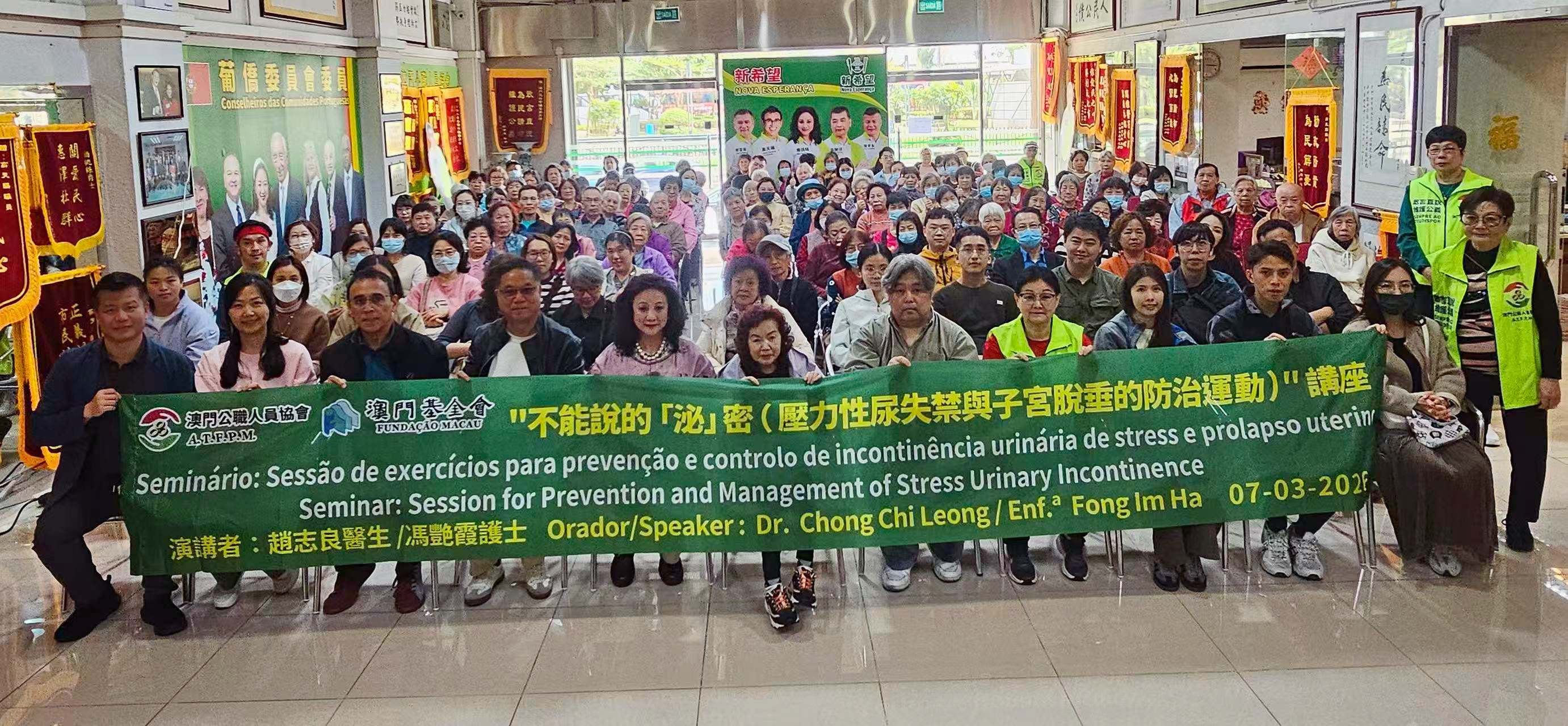 為關懷會員與澳門市民之身心健康,尤其專注女性盆底健康議題,在澳門基金會贊助下,澳門公職人員協會訂於二零二六年三月七日下午三時,主辦「不能說的『泌』密(壓力性尿失禁與子宮脫垂之防治運動)」健康科普講座。特邀本澳資深醫療專家趙志良醫生、馮艷霞專科護士兼本會理事會助理秘書長擔任主講嘉賓,為與會人士傳授專業務實之盆底健康防治知識,引導大眾以科學態度認知與面對相關健康問題。理事會主席高天賜、會員大會主席姍桃絲、理事會財政助理楊敏儀、行政秘書陳孝永及中華傳統文化協會會長余堯洪出席是次專題講座。